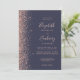 A margem esquerda deste elegante convite de casamento moderno apresenta um rosa dourado faux glitter design. O texto personalizável combina manuscrito colorido de rosa pálido, fontes copperplate e itálico em um fundo azul escuro. O verso apresenta um design brilhante rosa e preto correspondente.