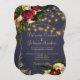 Um belo convite rústico ao casamento no inverno tradicional, que inclui buquês de flores de pedras de rosas escuras de burgundy e de creme de marfim, cordas de luzes cintilantes, folhas de ouro e folhagem, e um roteiro de caligrafia em ouro falso em forma de chic sobre um fundo azul-marinho escuro. ++++++++++++ O convite é adequado para cerimônias e recepções de casamento elegantes de época de inverno.