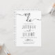 Escrita cursiva caligrafia de estilo manuscrito, convite de casamento preto e branco. O dorso inclui um padrão geométrico preto e branco.
