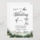 Um convite elegante para o casamento com montanhas de aquarelas e pinheiros que você pode personalizar com seus detalhes.