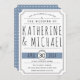 Este convite de casamento elegante com estilo de ingresso mostra um design moderno de tipografia preto e branco. Adicionando um toque de sofisticação, o convite é belamente acentuado com uma cor azul macia e poeirenta. Os nomes do casal são apresentados artisticamente numa tipografia de estilo branco desenhada à mão, criando um encantador contraste contra o fundo branco. Para destacar o dia especial, a data do casamento é exibida em uma faixa azul na moda. Há também uma fronteira negra com cantos invertidos ao seu redor. No verso do convite, um padrão geométrico cativante, com cruzes brancas sobre um pano de fundo azul, adiciona um toque de talento contemporâneo.