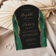 Este elegante convite de casamento moderno em forma de arco apresenta a emerald green watercolor bordas laterais, aparadas com falso brilho dourado. O texto personalizável combina manuscrito dourado, fontes em copperplate e itálico em um fundo de cinza de carvão escuro. O verso apresenta um design emerald verde e dourado.