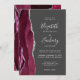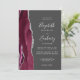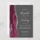 A borda esquerda deste elegante convite de casamento moderno apresenta uma cor d'água borrifada com borda cortada com cintilação falsa de prata. O texto personalizável combina manuscrito, copperplate e fontes itálicas em branco em um fundo de cinza de carvão. O lado inverso apresenta um design de burgundy e agate prateado.