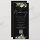Um convite de casamento floral verde que inclui uma tipografia elegante de escrita de caligrafia branca e o seu website de casamento Código QR num fundo negro. Projetado por Thisnotme©