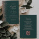A margem esquerda deste elegante convite de casamento moderno apresenta um rosa dourado faux glitter design. O texto personalizável combina uma letra pálida de cor rosa, uma placa de impressão e fontes itálicas em um fundo verde esmeralda escuro. O verso fornece espaço para detalhes do casamento em um fundo verde escuro sólido, junto com um código QR que os convidados podem digitalizar para visitar seu site e RSVP, o que economiza o custo de imprimir e enviar cartões RSVP separados.