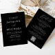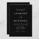Convites de casamento simples e elegantes, todos em um, com um roteiro branco e manuscrito, misturado com letras modernas, contra fundo preto. Personalize a frente do convite de casamento minimalista com seu nome e detalhes do casamento. Personalize a parte de trás do convite com detalhes de casamento, como informações de recepção, acomodações de hotel, instruções de RSVP e site de casamento. Adicione o link desejado do site de casamento ao modelo de Código QR fornecido para que seus convidados possam facilmente RSVP on-line e exibir informações adicionais sobre o casamento. Os convites de casamento preto e branco são a escolha perfeita para casamentos modernos.