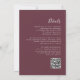 Este simples convite de casamento moderno mostra um texto burgundy sobre fundo branco. Adicione os nomes da noiva e do noivo na caligrafia de escrita manual do na moda e os detalhes na fonte sans serif. O verso oferece espaço para detalhes do casamento, juntamente com um código QR que os convidados podem digitalizar para visitar seu site e RSVP, o que economiza o custo de impressão e envio de RSVP separados.