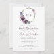 Esta design de casamento apresenta as iniciais da noiva e do monograma do noivo em roxo escuro, enquadradas por uma camada aquosa de flores roxas em um círculo de folhas falsas de ouro. Personalize o texto com os nomes dos casais no elegante roteiro de mão roxo escuro e os detalhes do casamento em cinzas de carvão. O verso fornece espaço para detalhes do casamento em um fundo branco sólido, junto com um código QR que os convidados podem digitalizar para visitar seu site e RSVP, o que economiza o custo de imprimir e enviar cartões RSVP separados.