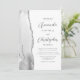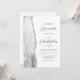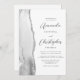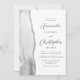 A borda esquerda deste elegante convite de casamento moderno apresenta uma cinza e uma aquarela branca, aparada com falso brilho prateado. O texto personalizável combina o script de cinza de carvão e as fontes sans serif em um fundo branco. O verso oferece espaço para detalhes do casamento, juntamente com um código QR que os convidados podem digitalizar para visitar seu site e RSVP, o que economiza o custo de impressão e envio de cartões RSVP separados.