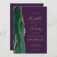 A borda esquerda deste elegante convite de casamento moderno apresenta uma esmeralda verde aquarela agate borda com falsa brilho dourado. O texto personalizável combina manuscrito dourado, fontes em copperplate e itálico em um fundo roxo. O verso fornece espaço para detalhes do casamento em um fundo roxo sólido, junto com um código QR que os convidados podem digitalizar para visitar seu site e RSVP, o que economiza o custo de imprimir e enviar cartões RSVP separados.
