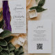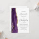 A borda esquerda deste elegante convite de casamento moderno apresenta uma cor d'água roxa, borda agitada, aparada com falso brilho dourado. O texto personalizável combina o script de cinza de carvão e as fontes sans serif em um fundo branco. O verso oferece espaço para detalhes do casamento, juntamente com um código QR que os convidados podem digitalizar para visitar seu site e RSVP, o que economiza o custo de impressão e envio de cartões RSVP separados.