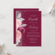 A borda esquerda deste elegante convite de casamento moderno apresenta um buquê floral em tons de burgundy e rosa-pincel, aparados com folha de falso prateado e folhagem de falso brilho e borrifados com brilho de prata. O texto personalizável combina o script de escrita manual de cinzas prateadas, fontes em copperplate e itálico em um fundo burgundy. O verso fornece espaço para detalhes do casamento em um fundo sólido de burgundy, junto com um código QR que os convidados podem digitalizar para visitar seu site e RSVP, o que economiza o custo de imprimir e enviar cartões RSVP separados.