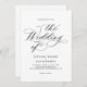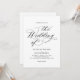 Este convite para o casamento apresenta uma design elegante e minimalista, com a caligrafia negra clássica e fontes serif em fundo branco.