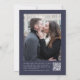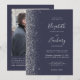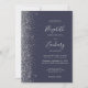 A margem esquerda deste elegante convite de casamento moderno apresenta um design de cintilação de prata. O texto personalizável combina a escrita manual de cinzas prateadas, fontes copperplate e itálico em um fundo azul escuro. Adicione sua foto favorita ao verso, juntamente com texto adicional e um código QR para enviar convidados para o site do seu casamento.