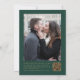 A borda esquerda deste elegante convite de casamento moderno apresenta uma coloração aquosa preta, borda agitada, aparada com falso brilho dourado. O texto personalizável combina manuscritos dourados, copperplate e fontes itálicas em um fundo verde escuro. Adicione sua foto favorita ao verso, juntamente com texto adicional e um código QR para enviar convidados para o site do seu casamento.