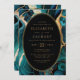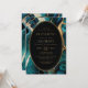 Um elegante quadro azul lacrimogêneo e branco dourado proporciona a definição para o texto dourado num fundo oval preto. A design é repetida no verso, que dá espaço para detalhes adicionais do casamento. Adicione um código de QR que os convidados podem digitalizar para visitar seu site e RSVP, o que economiza o custo de impressão e envio de placas RSVP separadas.