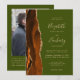 A borda esquerda deste elegante convite de casamento moderno apresenta uma cor de água laranja queimada, aparada com falsa brilho dourado. O texto personalizável combina manuscritos dourados, cunhas e fontes itálicas num fundo verde-oliva. Adicione sua foto favorita ao verso, juntamente com texto adicional e um código QR para enviar convidados para o site do seu casamento.