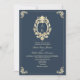 Celebre seu grande dia ao estilo do eterno com este elegante convite de casamento azul marinho com sotaques de ouro ornamentado e uma crista monográfica regal. O fundo do marinho profundo adiciona sofisticação, enquanto o código QR no verso torna o RSVP e o site de casamento simples para os convidados. Uma mistura perfeita de elegância tradicional e comodidade moderna, ideal para uma queda ou casamento no inverno clássicos.