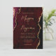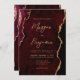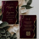 Este elegante convite de casamento mostra uma imagem de fundo da cor vermelha da água da burgundy, agada com brilho de ouro falso. O texto personalizável combina manuscrito, protetor e fontes itálicas de cor dourada. O verso fornece espaço para detalhes do casamento em um fundo de agata burgundy correspondente, junto com um código QR que os convidados podem digitalizar para visitar seu site e RSVP, o que economiza o custo de imprimir e enviar cartões RSVP separados.