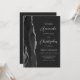 A borda esquerda deste elegante convite de casamento moderno apresenta uma coloração aquosa preta e borda agitada com falso brilho prateado. O texto personalizável combina o script de cinza prateada e as fontes sans serif em um fundo preto de slate. O verso fornece espaço para detalhes do casamento em um fundo preto de slate sólido, junto com um código QR que os convidados podem digitalizar para visitar seu site e RSVP, o que economiza o custo de imprimir e enviar cartas RSVP separadas.