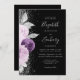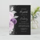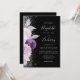 O canto esquerdo deste elegante convite para casamento moderno apresenta um buquê floral em tons de roxo e lavanda, aparado com folha de falso prateado e folhagem falsa e aspergido com brilho de prata. O texto personalizável combina o script de escrita manual de cinzas prateadas pálidas, fontes em copperplate e itálico em um fundo preto. O verso fornece espaço para detalhes do casamento em um fundo preto sólido, junto com um código QR que os convidados podem digitalizar para visitar seu site e RSVP, o que economiza o custo de imprimir e enviar cartões RSVP separados.