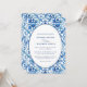 Convite para Casamento por Aquarela Moderno Azul e Branco do Mediterrâneo. Padrão azul e branco maravilhoso inspirado por azulejos mediterrânicos e blues costeiros em branco, com um centro oval com texto em linda tinta azul com uma elegante amante. Personalize com os nomes da noiva e noiva, data do casamento, hora, local do casamento. Excelente para casamentos de destino, casamentos costeiros, casamentos de países e muito mais. Convidamo-lo a visitar a nossa loja Zazzle, Austen e Grace, para combinar produtos e muito mais. Entre em contato conosco se precisar de assistência.