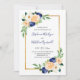 Estes convites modernos de casamento apresentam um design floral de aquarela com flores brancas, corais e marinhos azuis e uma falsa borda dourada. Personalize o texto do convite com o seu próprio texto.