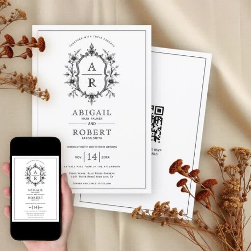 Monograma floral da crista branca preta e convite para casamento na fronteira. Este convite para o casamento apresenta uma crista floral vintage, preta e branca, perfeita para anunciar seu dia especial com elegância. A crista que chama os olhos age como o ponto focal, mostrando elegantemente suas iniciais. Abaixo da crista, seus nomes estão lindamente arranjados, melhorando a design geral na frente. Todos os elementos são colocados dentro de uma borda negra. A parte de trás do convite é um preto sólido e elegante.