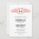 Crista heráldica vermelha e convite de casamento de iniciais. Apresenta um quadro floral vermelho e branco com as suas iniciais numa crista heráldica e flores, folhas e romãs. O dorso inclui um padrão vermelho e branco de bolinhas de tomate cereja.