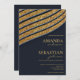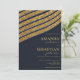 Este convite de casamento da tipografia geométrica azul e dourada de oxford moderno é a design perfeita para complementar um evento clássico e sofisticado. Apresenta uma tipografia de ouro simples e elegante sobre fundo azul escuro. Este design contemporâneo, único e clássico impressionará todos os seus convidados.