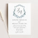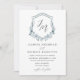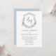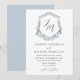 Convites florais elegantes que incluem as suas iniciais monográficas num roteiro de caligrafia negra rodeado por uma crista com rosas azuis e brancas empoeiradas, folhas de eucalipto exuberantes e folhagem verde rica. Personalize os convites de casamento florais azuis empoeirados com seus nomes e detalhes de casamento abaixo.