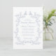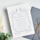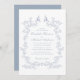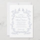 Convite de casamento elegante com uma moldura de aquarela ornamentado composta por florais e folhas delicadas, empoeiradas, de cor azul, com duas aves vivas no topo. Os nomes da noiva e do noivo estão em uma escrita azul empoeirada e os detalhes do casamento estão em simples inscrições azuis empoeiradas. Perfeito para casais que abraçam a estética popular do milênio, misturando o romance de uma era passada com um toque refrescantemente contemporâneo.