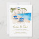 Ponha o tom para o casamento de destino dos seus sonhos com este convite de casamento inspirado pela Santorini. Apresentando uma ilustração com aquarela macia de uma praia ao lado do penhasco, icônicos prédios com laço e guarda-chuvas azuis profundos, esta design captura perfeitamente a essência do romance da ilha grega. Ideal para casamentos costeiros, comemorações de verão ou getaways mediterrânicos.