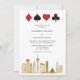 Convite moderno, elegante de Casamento de Destino de Las Vegas. A design apresenta o Skyline de Las Vegas City Em ouro, clubes, diamantes, corações e ícones de espadas em um quadro elegante de ouro e detalhes de casamento em letras de tendências na frente. Adicione a sua foto favorita ao fundo do convite.