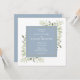 Apresentando delicadas folhas rústicas de cor d'água de eucalipto, este convite de casamento botânico moderno pode ser personalizado com seus detalhes especiais do dia do casamento em um fundo azul empoeirado. Projetado por Thisnotme©