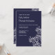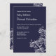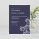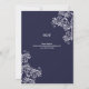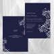 Um Convite para Casamento de Estilo Elegante Branco e Marinho desenhado com sotaque decorativo branco sobre fundo marinho, frente e verso. O texto do lado do cobrir do convite inclui: Nomes da noiva e do noivo, data de casamento, hora, local e nota de recepção. O texto do lado inverso inclui: RSVP e seus Detalhes de RSVP. Para personalizar, simplesmente insira seu texto em nosso modelo fácil, substituindo o exemplo. Certifique-se de ver toda a Coleção de Casamentos de Estilo Elegante Branco e Marinho para cartas e acessórios correspondentes.