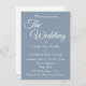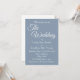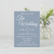 Estilo simples, convite de casamento que apresenta um fundo azul tendencioso e empoeirado de cor, juntamente com os nomes da noiva e do noivo futuros e a data do evento, hora, local e registro impressos em um script branco e estilizado. Personalize seu convite de casamento substituindo informações por seu. Selecione o estilo e a quantidade do seu papel de convite. Projetado para coordenar com nossa coleção de Casamento de Estilo Simples Dusty Blue.