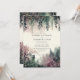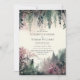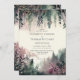 Uma ilustração com aquarela esbranquiçada da folhagem esmagadora em verde esmeralda e mauve e roxo, brilhante com luzes de fadas e poeira mágica, com as montanhas ao fundo e uma adorável fada escondida no verde, decora este convite de casamento outono verão com um tema de floresta encantado. Um convite elegante e moderno para um casamento de conto de fadas. Perfeito para noivas que amam o cenário florestal de conto de fadas, o tema da floresta de fadas ou do jardim de fadas e esmeralda verde, mauve e ouro.
