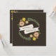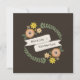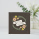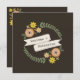 Um convite para o casamento de outono com ilustração de flores e verde, organizado em círculo com faixa no centro. Personalizar com nomes. O lado oposto apresenta flores no canto superior esquerdo e inferior direito. Personalize o texto com detalhes da sua ocasião. O fundo é marrom. A redação é dos pais da noiva.