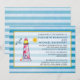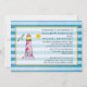 Um convite de casamento com tema náutico. Projetado com um padrão de listras azuis e uma moldura de ouro semitransparente sobreposta. Um farol com listras vermelhas e uma bola de praia, e um sol sorridente e uma gaivota voando ao longe posicionados dentro da moldura. Personalize com os detalhes do seu casamento. Perfeito para um casamento marítimo / costeiro casual.