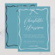 Um simples guião manuscrito moderna e minimalista tipografia branca no convite de casamento azul, enquadrado com uma fita ondulada com arco em estilo desenhado à mão. Estilo informal de coquete branco. Disponível em impressão, como download digital ou ambos.