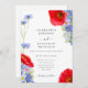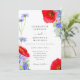 Linda mão elegante pintou flores silvestres botânicas de cor d'água do verão em azul de córnflor, roxo, rosa, vermelha, verde e amarela convite para o casamento. Flores, incluindo cosmos, flores, margaridas, papoilas, e me esqueçam de nãos com folhagem. Modelo fácil de usar com moderno e elegante roteiro de tipografia. Perfeito para um único casamento de verão ou primavera, azul botânico e púrpura de flor. Arte original única da artista Catherine Sweetman