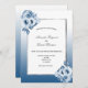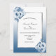 Na frente: um clássico fundo ombre azul e branco gradiente com um falso quadro prateado. Decorados com flores aquáticas, florais em tons de azul. Modelos para os nomes da noiva e do noivo e detalhes da festa. Os nomes são escritos com um moderno estilo escrito à mão, letras azuis. Verso: gradiente azul clássico.