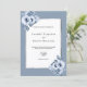 Na frente: fundo azul empoeirado com falso quadro prateado e branco. Decorados com flores aquáticas, florais em tons de azul. Modelos para os nomes da noiva e do noivo e detalhes da festa. O texto é escrito com letras coloridas a preto. Fundo: fundo azul empoeirado.