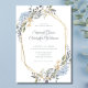 Convites de casamento com flores e folhas azuis em pó em moldura geométrica dourada romântica em aquarela. Adicione os detalhes do seu casamento a este convite de guirlanda botânica moderna. Este design elegante é ideal para casamentos de primavera e verão.
