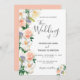 Um convite de casamento floral em branco, coral e pêssego. Um fundo branco chic na frente. Decorados com flores grandes e peludas, florais em branco, coral e pêssego. Escrita moderna e extensa, tipografia com o texto: O casamento de... Modelos para nomes e detalhes do casamento. Texto das cinzas escuras. Fundo: fundo colorido de coral.