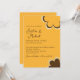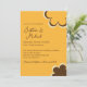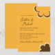 Este convite de casamento apresenta um tema retrô inspirado nos anos 1970. O fundo é de cor laranja, com texto marrom e os nomes do casal impressos em uma fonte elegante de caligrafia. Uma flor estilo anos 70, amarela e marrom, é impressa no canto inferior direito, com um contorno de flor correspondente no topo.