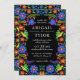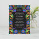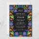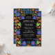 Convite de casamento Colorido Fiesta Mexicana com flores de arte popular contra um fundo preto dramático (você pode mudar a cor para atender ao seu gosto). Ótimo para casamentos no destino México, casamentos do Cinco de Mayo ou para alguém que ama a cultura mexicana. Parte da nossa coleção de Flores Mexicanas.