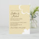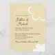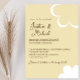 Este convite de casamento apresenta um tema retrô inspirado nos anos 1970. O fundo é uma cor amarela suave, com texto marrom e os nomes do casal impressos em uma fonte de letra cursiva elegante. Uma flor estilo anos 70 branca é impressa no canto inferior direito, com um contorno de flor correspondente no topo.