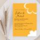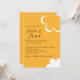 Este convite de casamento apresenta um tema retrô inspirado nos anos 1970. O fundo é de cor laranja, com texto marrom e os nomes do casal impressos em uma fonte de letra elegante. Uma flor estilo anos 70 branca é impressa no canto inferior direito, com um contorno de flor correspondente no topo.